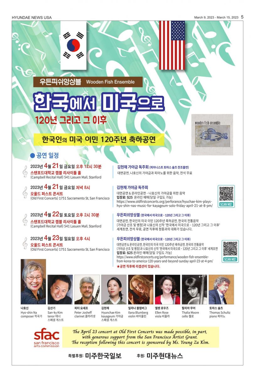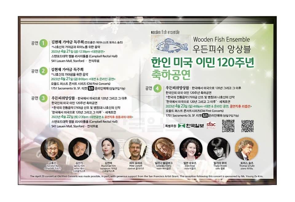 [공연 4] – 2023년 4월 23일 일요일 오후 4시 – 우든피쉬앙상블 – 한국에서 미국으로 – 120년 그리고 그 이후: 한국인의 미국 이민 120주년 축하공연 – 대면공연 & 온라인공연 – 25불 – 오울드 퍼스트 콘서트 시리즈(Old First Concerts) – 1751 Sacramento Street, San Francisco(당일 구입 가능) – 리셉션 있습니다!