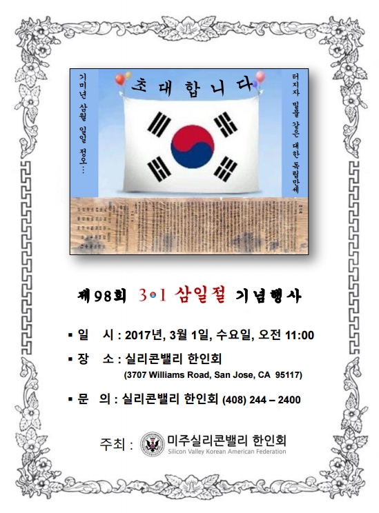 제98회 3.1절 기념 행사가 열립니다. 많은 참석 부탁드립니다.