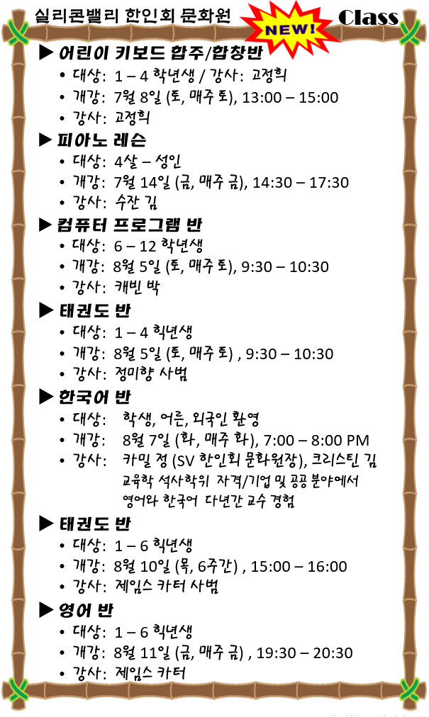 7월 실리콘밸리 한인회 문화원 프로그램입니다.