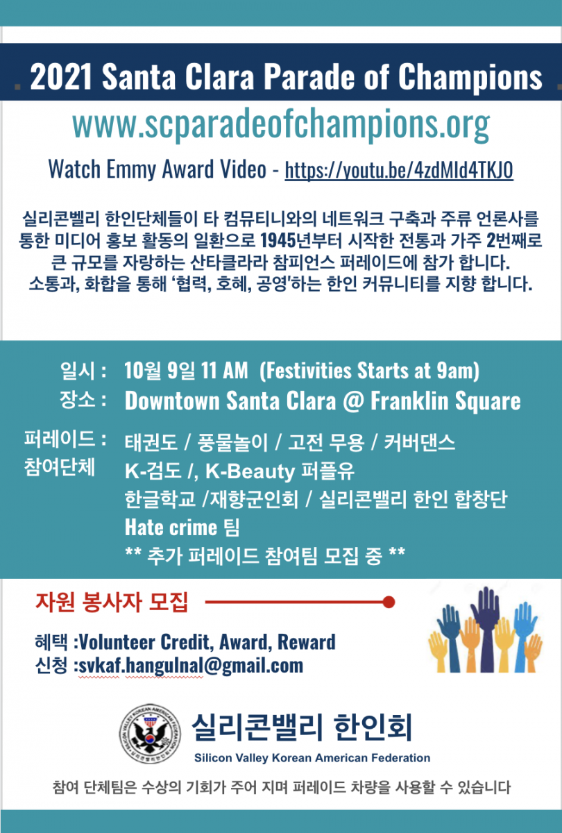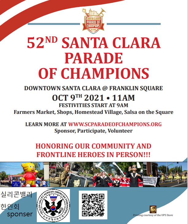 오는 10월 9일 토요일 11시부터 Santa Clara Parade of Champions에 약 83개의 팀이 참가하는 가운데 950 Monroe St., Santa Clara, California에서 열립니다.